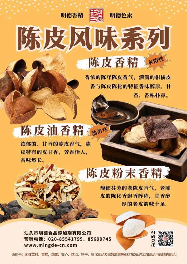 明德食品添加劑 緊跟市場潮流,應(yīng)運而生 推出了 陳皮香精。愿使各位食品生產(chǎn)廠家朋友們更好的在新風(fēng)味浪潮中,占領(lǐng)市場先機優(yōu)勢,永立潮頭。